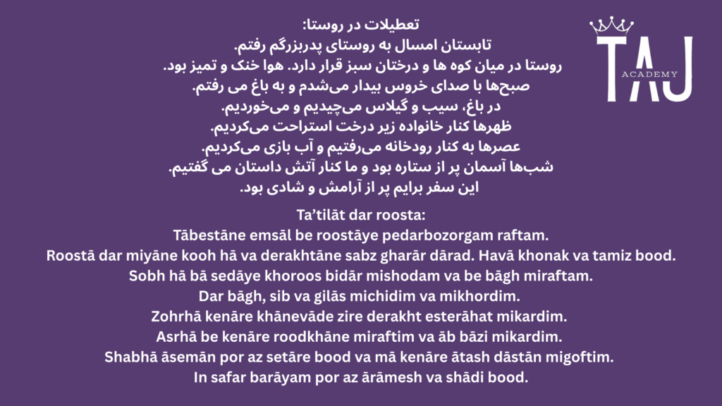 This A1 Persian passage is designed specifically for beginners. Whether you’re learning for personal interest, travel, or academic goals, Taj Academy provides you with the foundation you need to understand and speak Persian with confidence. Our lessons follow the CEFR framework for international standards in language learning.